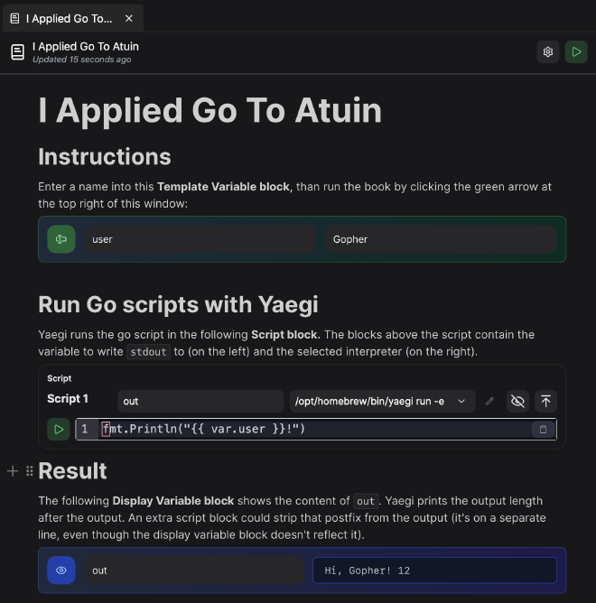 Atuin Desktop is for shell scripts what Jupyter Notebooks is for scientific scripts. You can compose Runbooks from documentation, shell scripts, SQL statements, kubectl get commands and interactive elements. I came across Atuin just recently (when they announced that Atuin Desktop goes open source) and instantly became curious if I could run Go code as a “shell script” inside a Runbook.