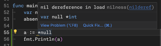 An option type, though, makes it impossible to forget the check for nil. The user must go through the “getter” methods Or() or Value() to access a wrapped pointer, and thus cannot forget to check the ok value or provide a fallback value.