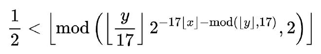 For given x and y, the formula determines whether to set a pixel at the coordinates (x,y) to black or white, depending on whether the result of the right side is less than, or greater or equal to, one half.