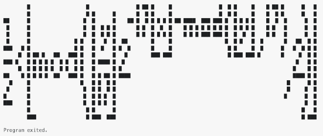 The rest of the code only needs to call tupperMatrix() and print out the result, using block characters for better appearance. (It's not as nice as a real bitmap, for the typical monospaced fonts have no square characters, and add spacing between characters and lines.)